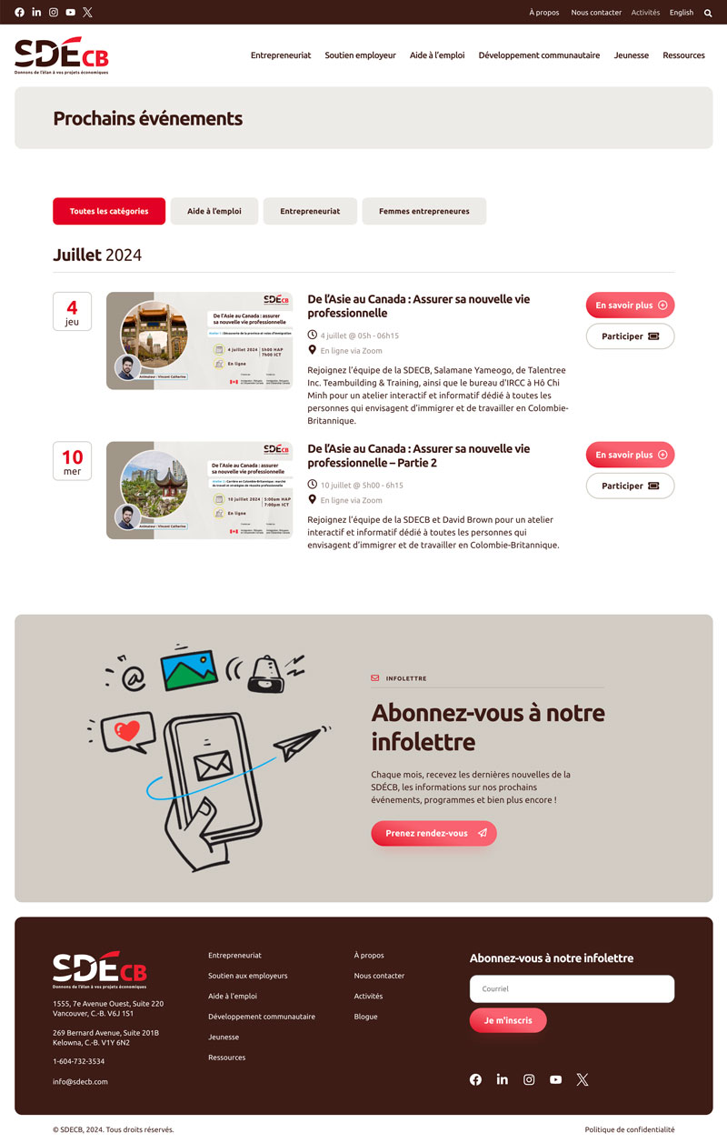 The SDECB required a new website that effectively communicated its value and services while demonstrating its deep expertise in economic development and entrepreneurship. The website was also intended to build trust with potential clients—including business owners and job seekers—and position the organization as a leading thought leader in British Columbia’s Francophone economic sector.